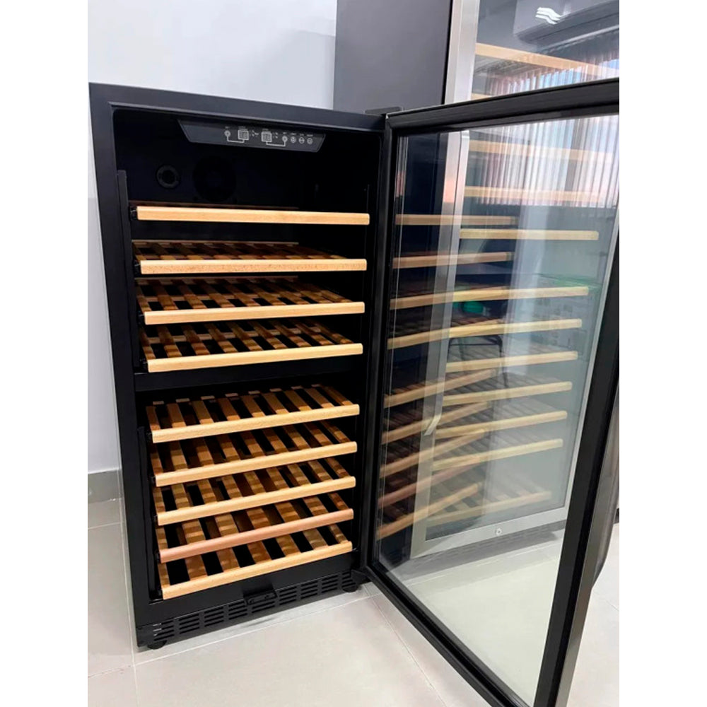 Comporta até 68 garrafas padrão Bordeaux (7,5cm). Modelos maiores podem reduzir capacidade total.