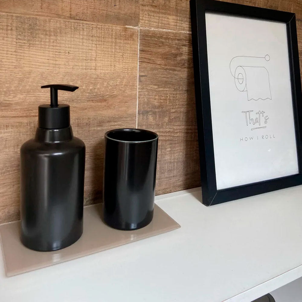 Composto por duas peças essenciais — porta-sabonete líquido e porta-escovas, o kit garante organização e praticidade no dia a dia, valorizando o espaço com um visual refinado.