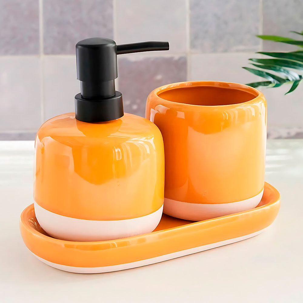 O kit conta com 3 peças essenciais para o dia a dia — porta-sabonete líquido, porta-sabonete em barra e porta-escovas — mantendo tudo em ordem com muito estilo.