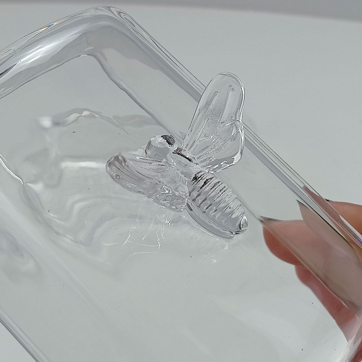 - Tampa de vidro que permite visualizar o conteúdo e mantém a manteiga protegida