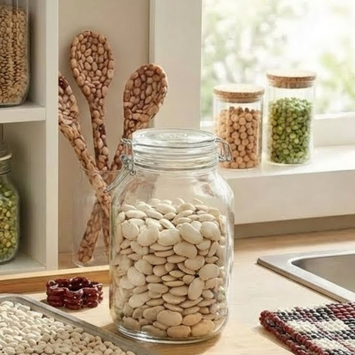 O pote tem uma capacidade de 3 litros, ideal para armazenar uma variedade de mantimentos como grãos, cereais, e biscoitos, mantendo tudo organizado.