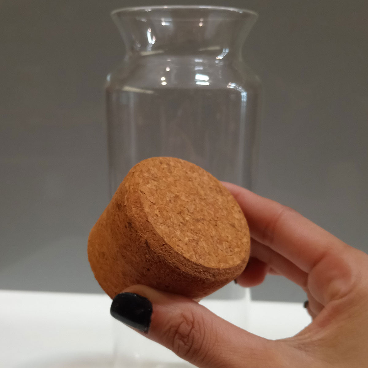 - Tampa de cortiça que proporciona um fechamento seguro e estiloso