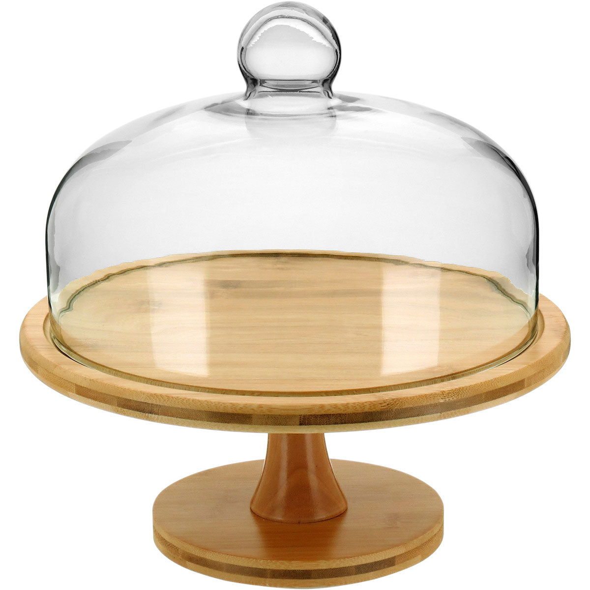 Prato de Bolo com Pé em Bambu e Tampa de Vidro 29cm Natural