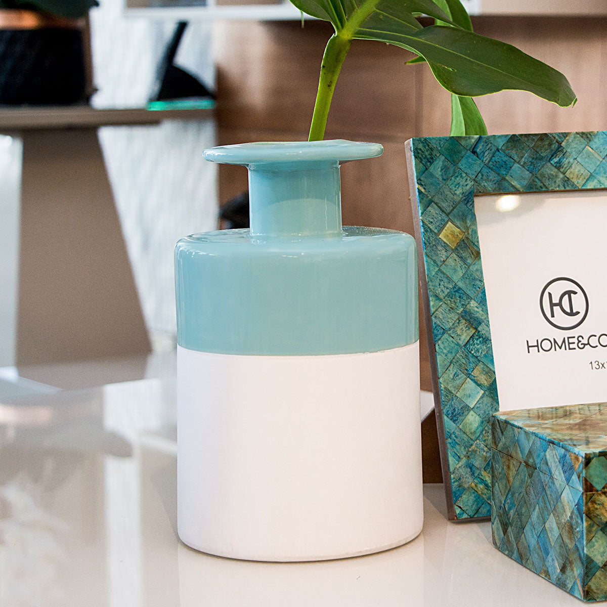 Transforme sua decoração com o nosso requintado vaso Aquamare em cerâmica azul. Com um design sofisticado e materiais de alta qualidade, este vaso é a escolha perfeita para realçar a beleza de qualquer espaço, seja na sua sala de estar, escritório ou hall de entrada.